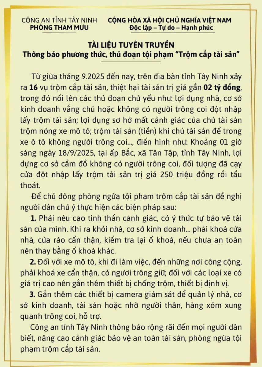 Thông báo phương thức thủ đoạn trộm cắp tài sản