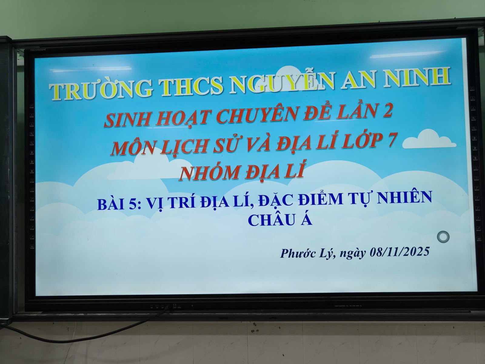 Ngày 8 tháng 11 năm 2025, tổ Chuyên môn 1 trường THCS Nguyễn An Ninh tổ chức buổi sinh hoạt chuyên đề phân môn Địa lí trong năm học 2025–2026. Buổi sinh hoạt do cô Lê Thị Lệ – giáo viên môn Địa lí của trường – trực tiếp giảng dạy và chia sẻ.